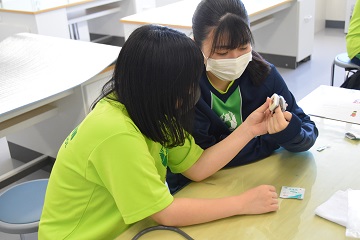 ・新型コロナウィルスについて、なぜ感染するのか、どのような感染症か、感染しないためにはどうしたらよいかの講義を受けました。また予防法として、アルコール消毒の正しいやり方、ガウンの着脱など感染予防演習を実施し、手洗いを可視化することで、十分に手洗いが出来ていないことが分かり、菌がついている手から物などへ感染拡大の様子も体験すること、今回の学んだことを正しく伝えることの重要性を感じました。