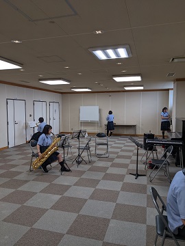 山梨県立都留興譲館高等学校 > 部活動 > 吹奏楽 > 吹奏楽部 7月の活動 2022年7月29日カテゴリー: 部活動 吹奏楽 ◆大会結果◆ 吹奏楽部 7月の活動 吹奏楽部の7月の活動を紹介します。7月は、17日に吹奏楽部にとって最も大きな大会である吹奏楽コンクールがあり、それに向けての練習がメインになりました。 7/2(土)・3(日)ホール練習 本校近くのうぐいすホールで、2日間ホール練習をしました。 7/9(土)・10(日)合奏講習会(甲府に宿泊) 高文連吹奏楽専門部主催の合奏講習会に参加しました。9日は本番演奏するホールであるYCC県民文化ホールで練習、10日は本番と同じように発表会形式で演奏を行い、講師の方から講評をいただける合奏講習会に参加しました。 またこの土日は、甲府にある青少年センターで宿泊・練習も行いました。ちょっとした合宿になり、練習はしっかりしつつ、楽しい時間も過ごしました。 お風呂から上がったあと、声でリズムをそろえる練習をしています。 7/12(火)野球応援 野球部が夏の大会に出場し、その野球応援を行いました。吹奏楽部にとっては3年ぶりの応援で、3学年とも野球応援を経験していません。慣れないこともあり大変でしたが、精一杯練習・演奏をさせていただきました。 7/17(日)第62回山梨県吹奏楽コンクール出場 吹奏楽部にとって年間で最も大きな大会である、吹奏楽コンクールに出場しました。演奏曲は、「百合は白く、そして気高く咲き」(山澤洋之作曲)です。 写真は、ホールに出発前、最終調整を学校で行っているところです。当日は、多くのOBの先輩方にお手伝いに来ていただきました。 人数は3学年合わせて7名と、おそらくコンクールでも最少人数の参加となりましたが、本番ではこれまでの練習の成果を出すべく、舞台で音楽を表現してきました。 結果は、3大会ぶりの銀賞をいただきました。悔しい部分も残りますが、精いっぱいできた満足感もあります。 これまで、多くの先生方、先輩方に支えていただき、助けていただいて、ここまで来ることが出来ました。本当にありがとうございます。これからも頑張っていきますので、応援よろしくお願いいたします。 *吹奏楽部では、部員を大募集中です(3年生が抜けると、1・2年で4名になってしまいます…)。見学等いつでもお待ちしておりますので、興味のある方はお近くの吹奏楽部員、または顧問の先生にお知らせください。 *来年3月18日(土)には、吹奏楽部第6回定期演奏会をうぐいすホールにて開催予定です。ぜひ足をお運びいただき、私たちの演奏を聴いていただければと思います。