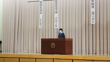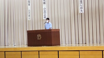 生徒会会長 立候補責任者と候補者の演説の様子です。