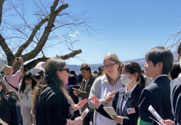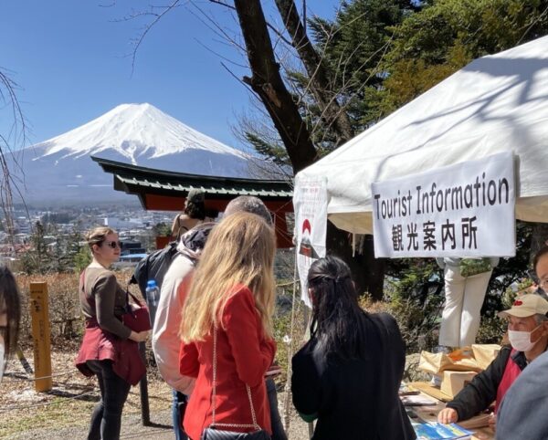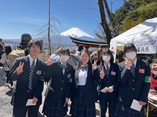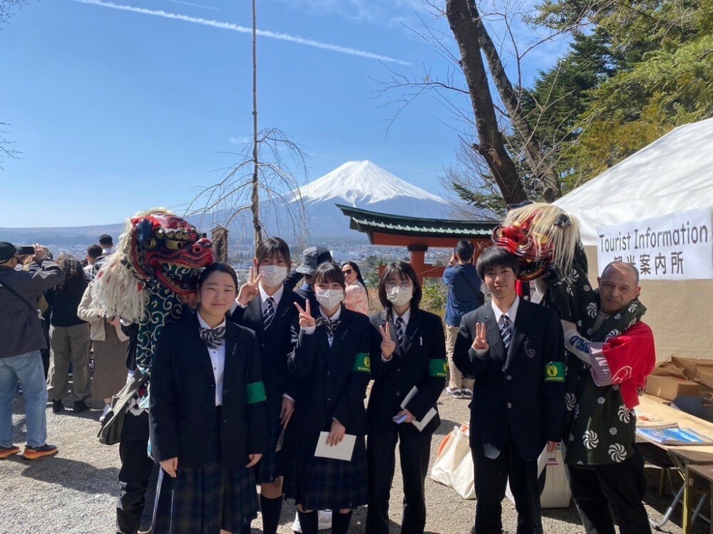 山梨県立都留興譲館高等学校 > 部活動 > 国際教養(旧英語部) > 【国際教養部】観光ガイドボランティア 2024Spring 2024年4月4日カテゴリー: 国際教養(旧英語部) 【国際教養部】観光ガイドボランティア 2024Spring 3月30日(土)31日(日)、観光ガイドボランティアを実施しました。 今回の舞台は新倉山浅間公園(忠霊塔)。当日は雲一つなく澄み切った青空。朝から世界中の観光客の方々でにぎわっていました。 富士吉田の獅子舞にも出会うことが出来ました。操っていたのは、なんと谷村工業高校の大先輩!!とっても嬉しい出会いでした。 地域の皆様、いつもお世話になっております。これからもよろしくお願いいたします。