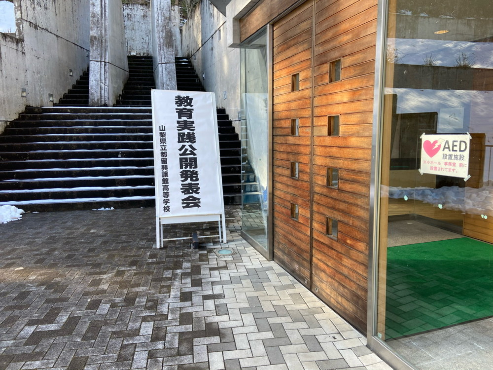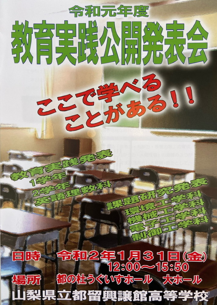 山梨県立都留興譲館高等学校 > 学校行事 > 教育実践公開発表会を実施 2020年1月31日カテゴリー: 学校行事 教育実践公開発表会を実施 今日1月31日は、うぐいすホールで教育実践公開発表会を行いました。 1年、2年、英語理数科、環境工学科、機械工学科、電子工学科、制御工学科が発表しました。 最後に石井指導主事に講評をいただきました。 校長先生あいさつ 1年生の発表 電子工学科の発表 展示 プログラム表紙 うぐいすホール