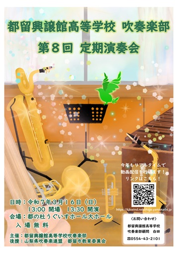 山梨県立都留興譲館高等学校 > お知らせ > 【吹奏楽部】 第8回 吹奏楽部 定期演奏会 ご案内 2025年2月27日カテゴリー: お知らせ 【吹奏楽部】 第8回 吹奏楽部 定期演奏会 ご案内 第8回 吹奏楽部定期演奏会を3月16日(日)うぐいすホールにて開催します。 開場13:00 開演13:30です。 部員一同、定期演奏会に向けて、頑張っております。 たくさんの方々に演奏を聴いて頂けると嬉しいです。 みなさま、ぜひ、お越しください。お待ちしております。