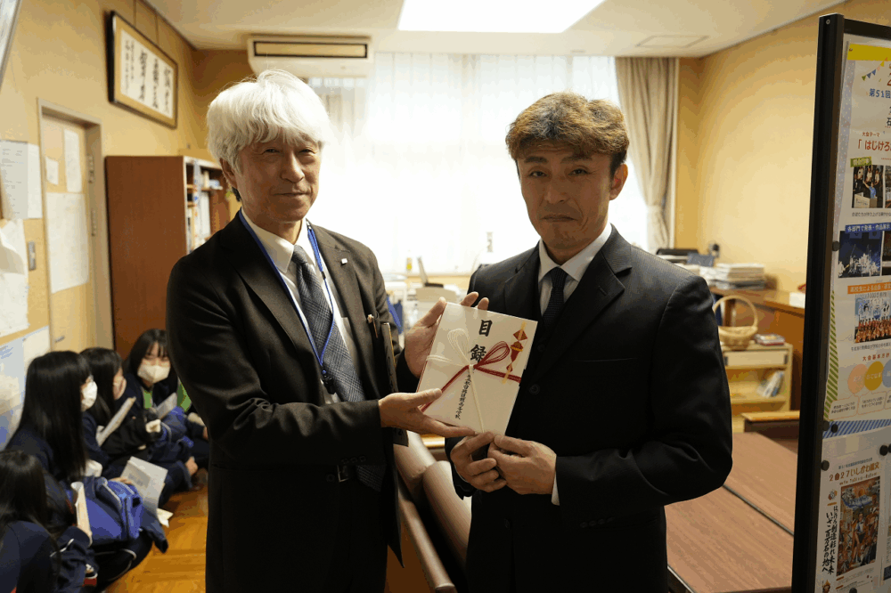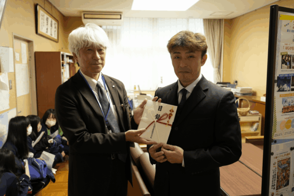 皆様から集めさせていただきました義援金は渡部PTA会長から輪島高校の平野校長に直接お届けしました。